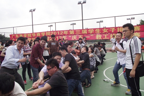 (记者 潘湜楠、杨建)4月24日下午3点,“庆五一”教工拔河比赛在学院篮球场如期举行。本次拔河比赛的学校教工参赛队伍有思政部、外语系、物业管理等9支。经过9轮殊死搏斗,获得冠军的是物业管理代表队,教育机构和经济系分别名列亚季军。