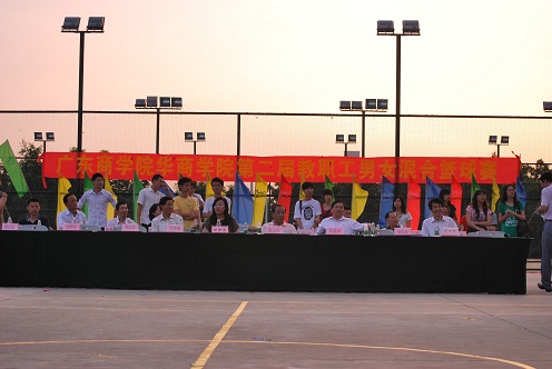 在学院领导的关怀与太阳城集团的鼎力支持下,众所期待的篮球争霸赛——广东商学院华商学院第二届教职工男女混合篮球赛决赛于2010年5月27日下午5:40在华商学院篮球场准时开战。太阳城集团副总经理、广东商学院华商学院董事廖伊曼,华商学院陈玉川院长,丘兆福副院长、邓基泽副院长、集团办聂世祥主任及各系、部、处主任观看了比赛并为获奖代表队颁奖。观看比赛的还有各系部老师、广大华商学子,场面是空前的盛大。
