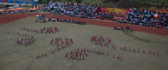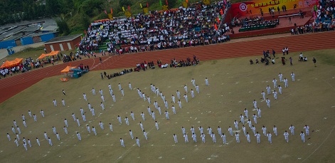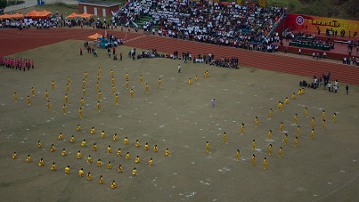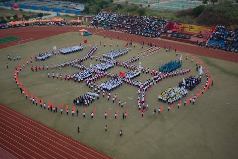 彩旗、鲜花队员、运动员组成的校徽