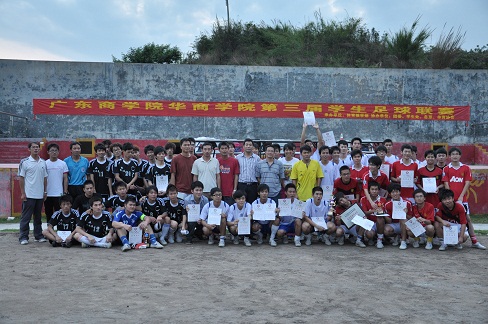 由广东商学院华商学院主办、体育教学部承办的我院第三届大学生男子足球联赛从4月12日开始进行了为期一个月的比赛,通过16场激烈的角逐最终决出了冠亚军。5月10日下午3时,冠亚季军争夺战在我院足球场隆重举行。学院体育教学部负责人徐振文老师、及体育教学部老师、各系的教师出席了本次比赛,并为获奖队伍颁奖。