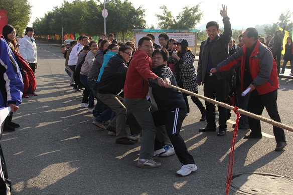 比赛场地上,冬日的艳阳高照,校庆的热闹氛围和喜庆的场面将现场的比赛气氛渲染的同天气一样热烈、奔放。“准备好,准备好……”“身体往后,脚步都摆好……”“绳子,把绳子拉直……”这些平时在课堂上、工作中一丝不苟的教职工们在拔河场上同样不含糊。裁判员一声令下,令旗一挥,比赛开始了。只见场上的队员们咬紧了牙,憋红了脸,弓起了腿,使出了浑身的劲儿拉着绳子;而每个参赛队的“啦啦队”员们也用力挥着双手,握紧了拳头,大声地喊着,“加油——加油——”有的人三局比赛下来,嗓子都喊哑了。正是他们整齐一致的加油声,使场上队员的力量在瞬间凝聚在一起,爆发出来。