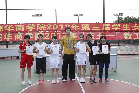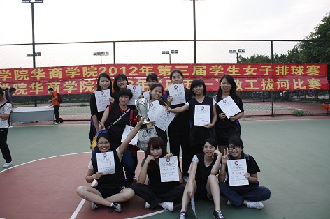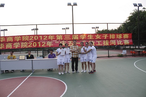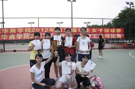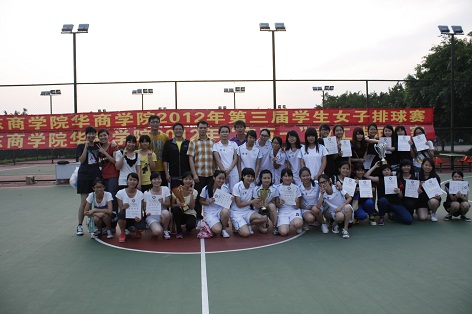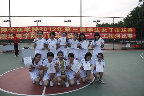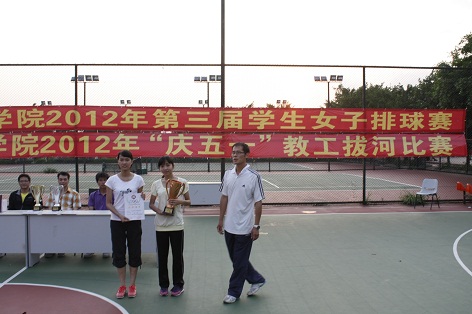 我院第三届学生女子排球赛经过6天的激烈角逐,于2012年4月24日星期二下午在我院排球场落下帷幕。全院8各队经过紧张激烈的争夺,最终旅游管理系获得冠军,工商管理系获得亚军,会计系获得季军,艺术系获得体育道德风尚奖,陈慧敏等6位选手获得优秀运动员称号。闭幕式上,体育教学部领导为以上获奖单位和个人颁发了证书和奖牌,并一起合影留念。