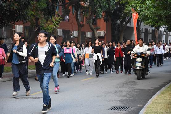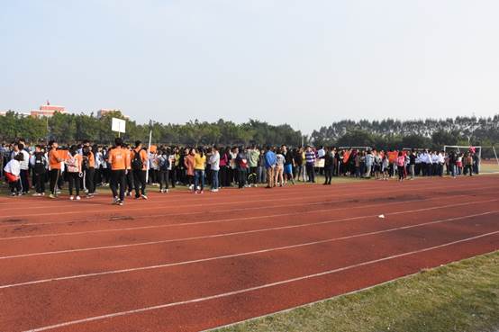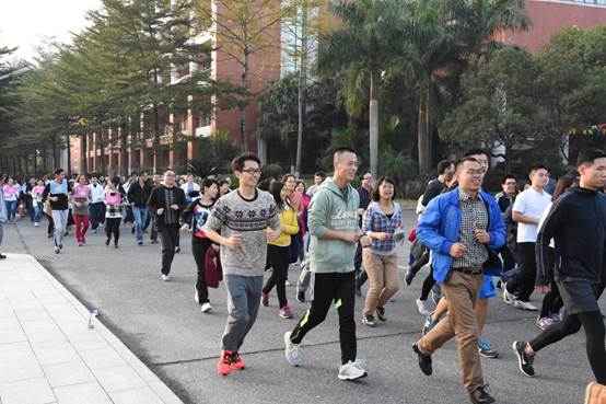 16时30分,长跑正式开始。随着苏宁书记一声令下,田径场瞬间被奋力起跑的同学淹没。按照教师在前学生在后跑的次序,本次比赛以田径场为活动起点,参赛者须经过学院大门口,随后沿着主干道经过校区创新楼、第四饭堂、综合楼、图书馆、明星餐厅回到田径场,环绕了几乎整个校园。在相对漫长的跑步过程中,师生们由始至终都精神昂扬,不少学院的同学还喊响口号,为彼此加油。经过约半小时的比赛,同学们陆续到达终点。虽然三公里左右的长跑并不轻松,但是本次参赛的1000名师生均在汗水中坚持不懈地跑完了全程,“校庆杯”环校长跑活动也在同学们的欢笑与汗水中落下帷幕。